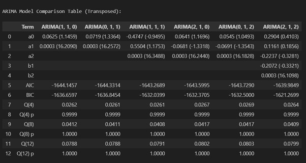 - Every modelling decision grounded in statistical testing — ADF, Ljung-Box, AIC/BIC comparison